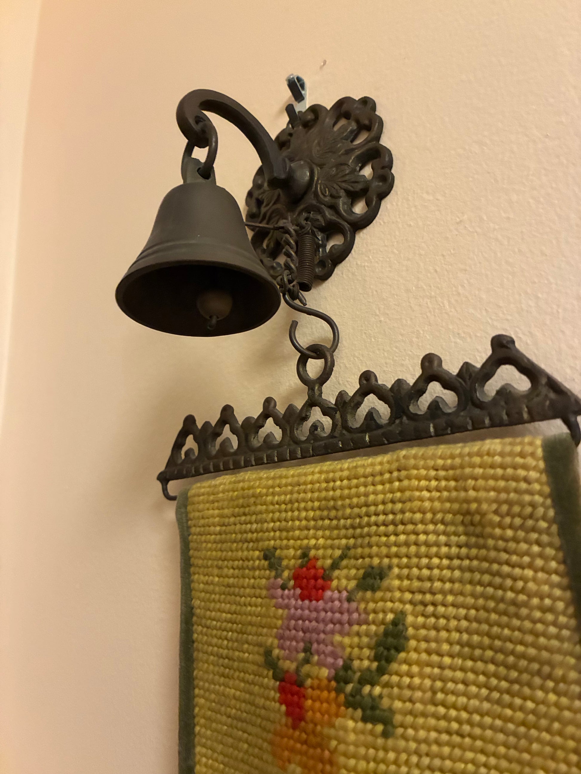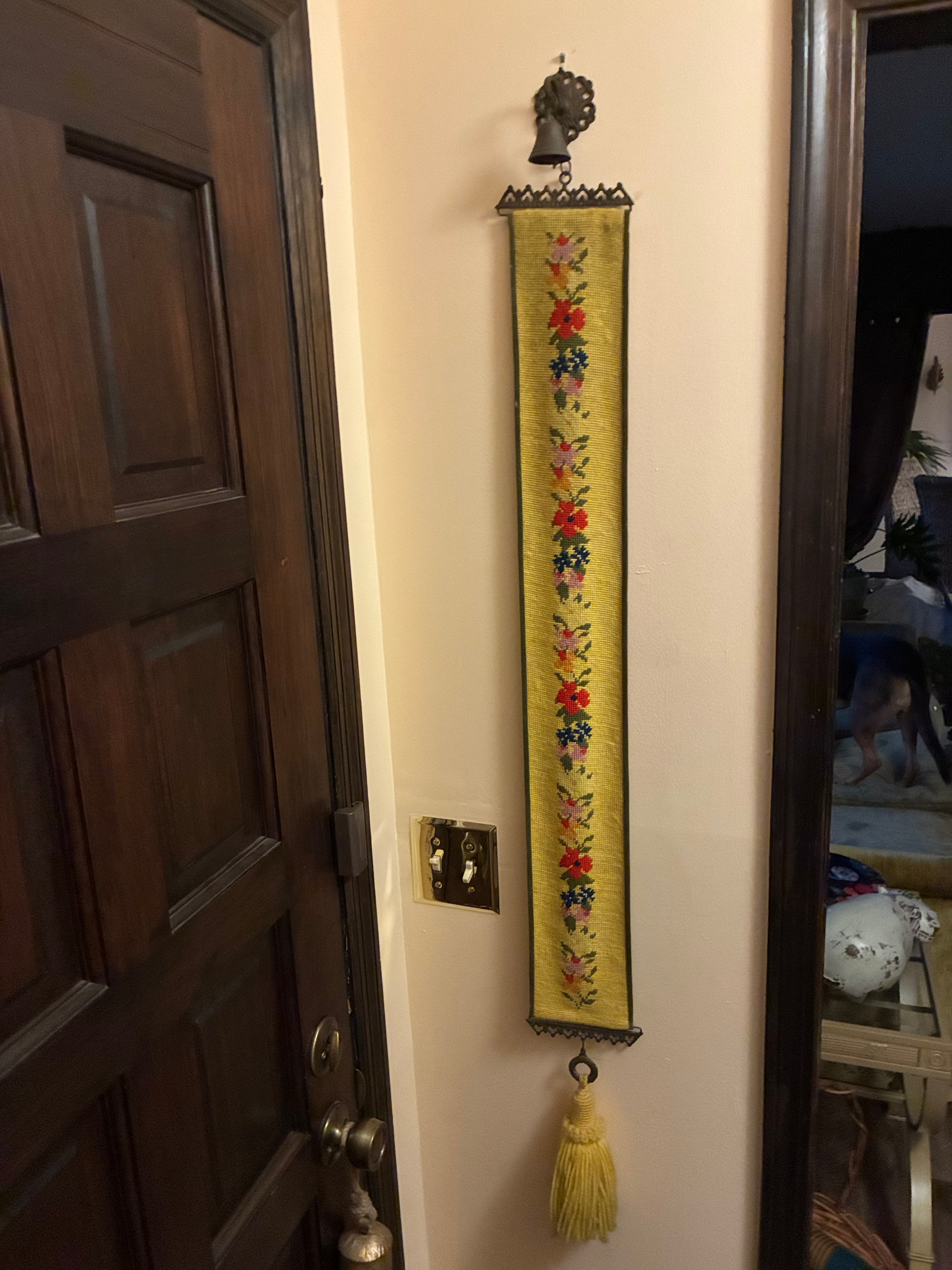 Lovely bright yellow with hand embroidered wool floral motif in bright primary colors. Ornate brass fittings on top and bottom. The bell makes a darling tinkle sound. The surround and back is in a moss green velvet.