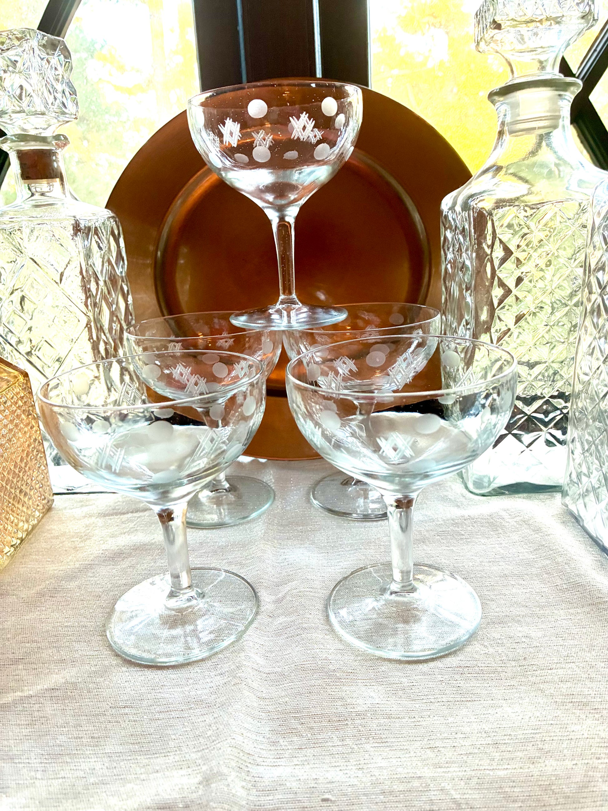 Indulge in the hey day glamour of bygone parties with this antique set of 5 criss cross and punties coupe champagne glasses. Perfect for adding a touch of nostalgia and style to your next gathering. Cheers to a time of elegance and luxury!