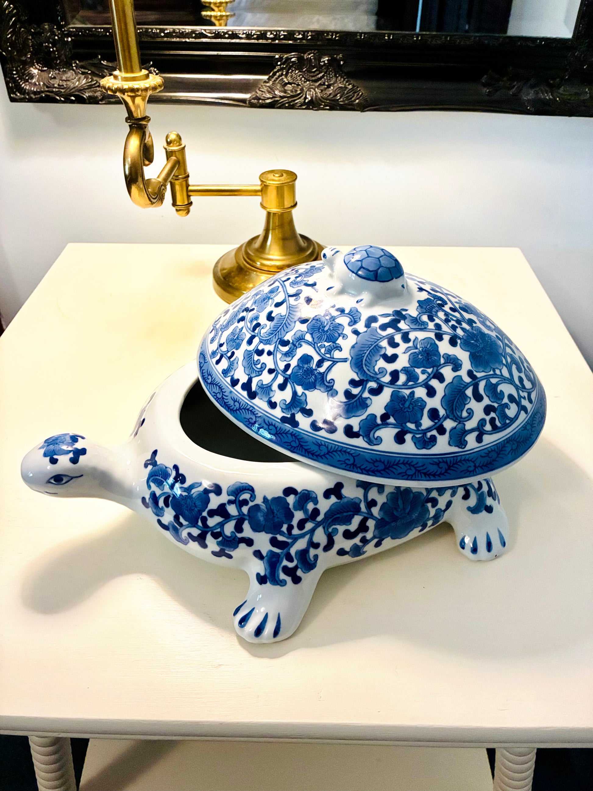 The Bombay Company ceramic turtle tureen boasts intricate blue and white detailing, measuring 15" x 11" x 7". Crafted with expert precision, this piece adds a touch of elegance to any dining experience. Its unique design and spacious interior make it the perfect addition to your serveware collection.