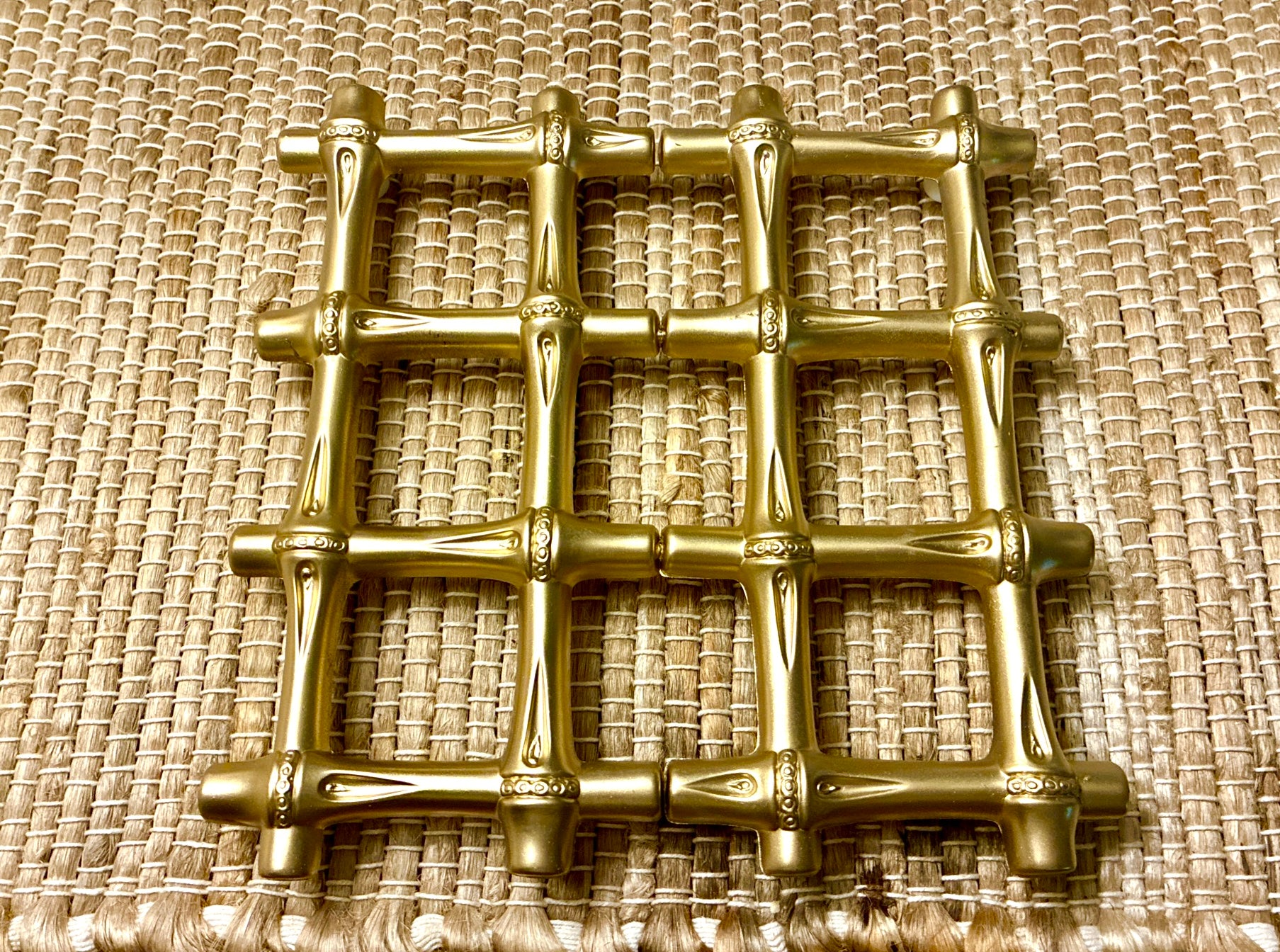Expertly designed with iconic bamboo, this gold metal trivet is a unique kitchen essential. Its expandable design allows it to be used at 7x7" or expanded to 10x7", providing versatile and stylish protection for your countertops and tabletops.