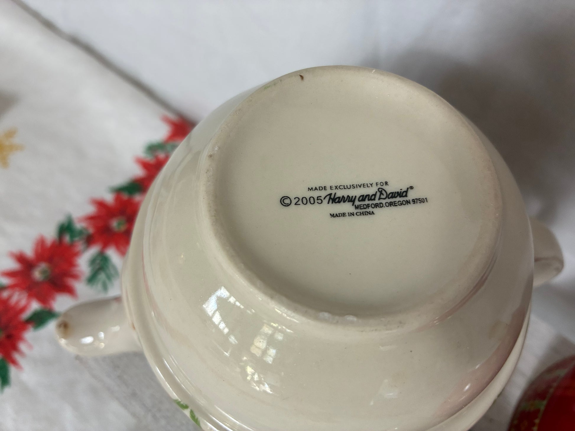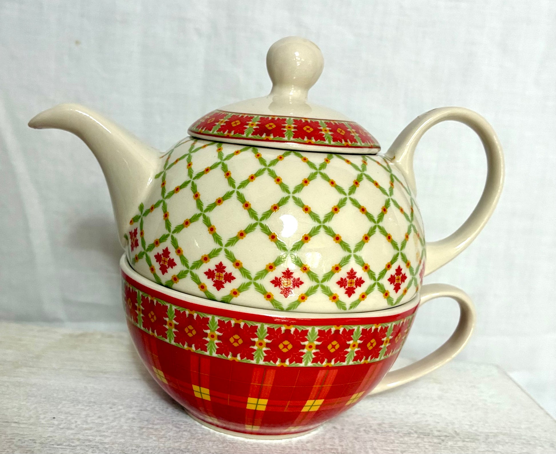 The Harry & David teapot & cup set features the Darling checkered design in a beautiful red with soft green and yellow highlights. At 7" x 5 1/2", this teapot and cup set is the perfect addition to any tea lover's collection. Enjoy a warm cup of tea in style with this charming set.