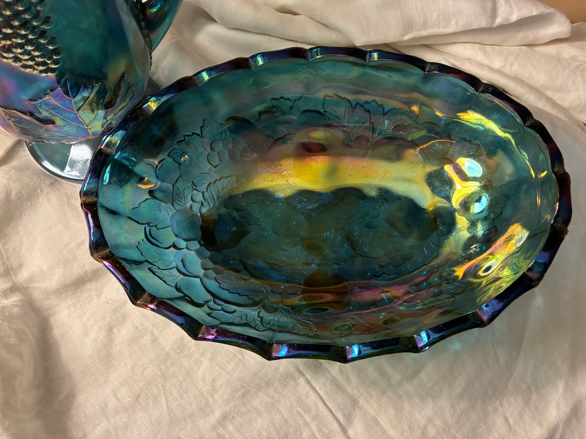 Stunning blue carnival glass with amazing iridecence on an harvest grape pattern.Pitcher is 64 oz. Oval serving bowl is 12 " across.