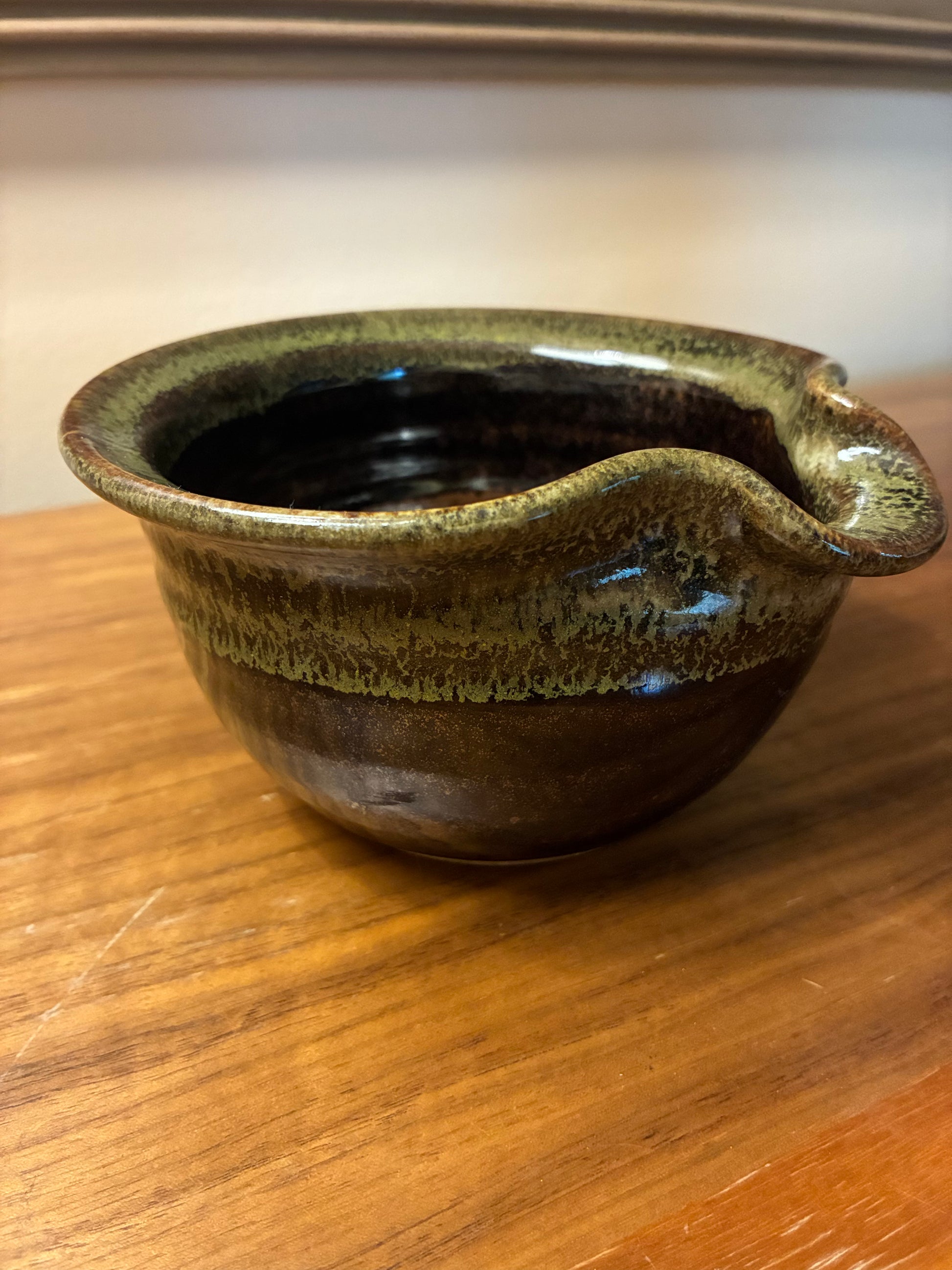 Green variations blend so beautifully into the detail of this handmade piece. This is a compact spouted bowl,perfect for small batch sauces,a pinch bowl or decoratively with spices or flowers. It would be a great accent anywhere! This is 6"x4"