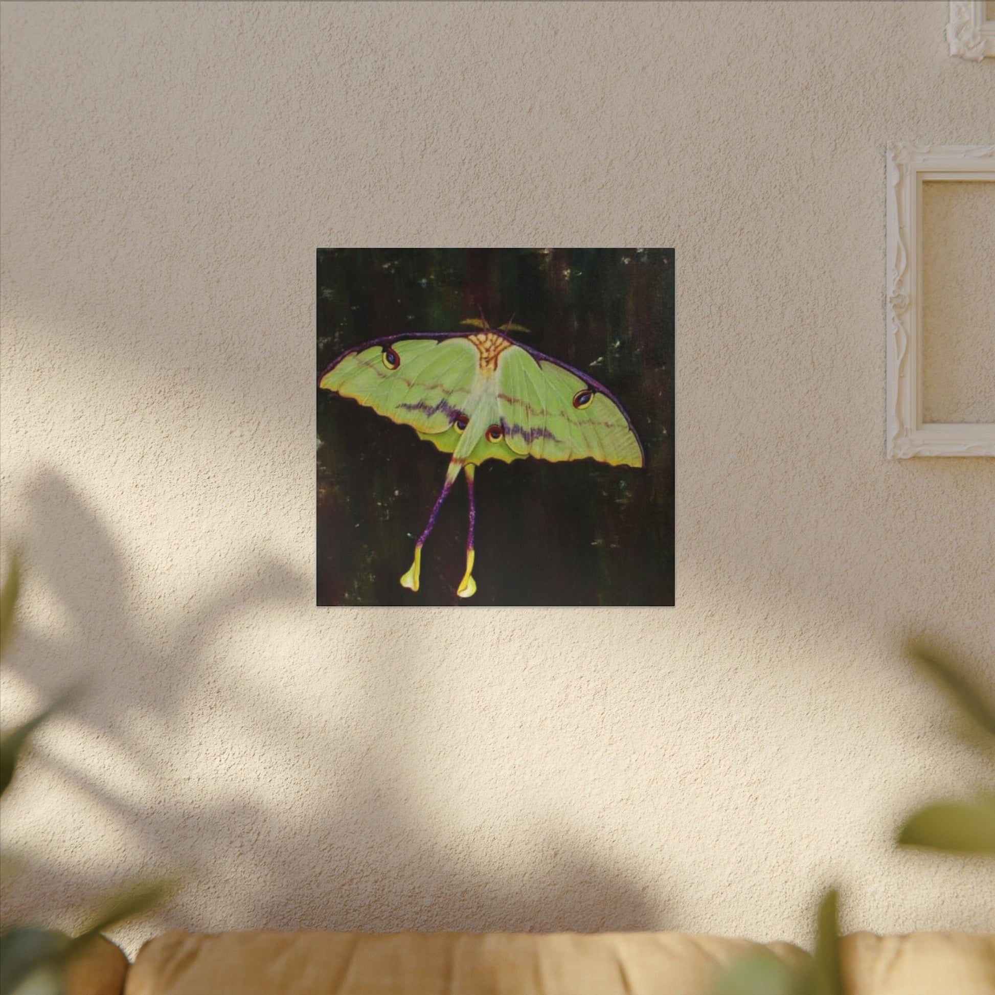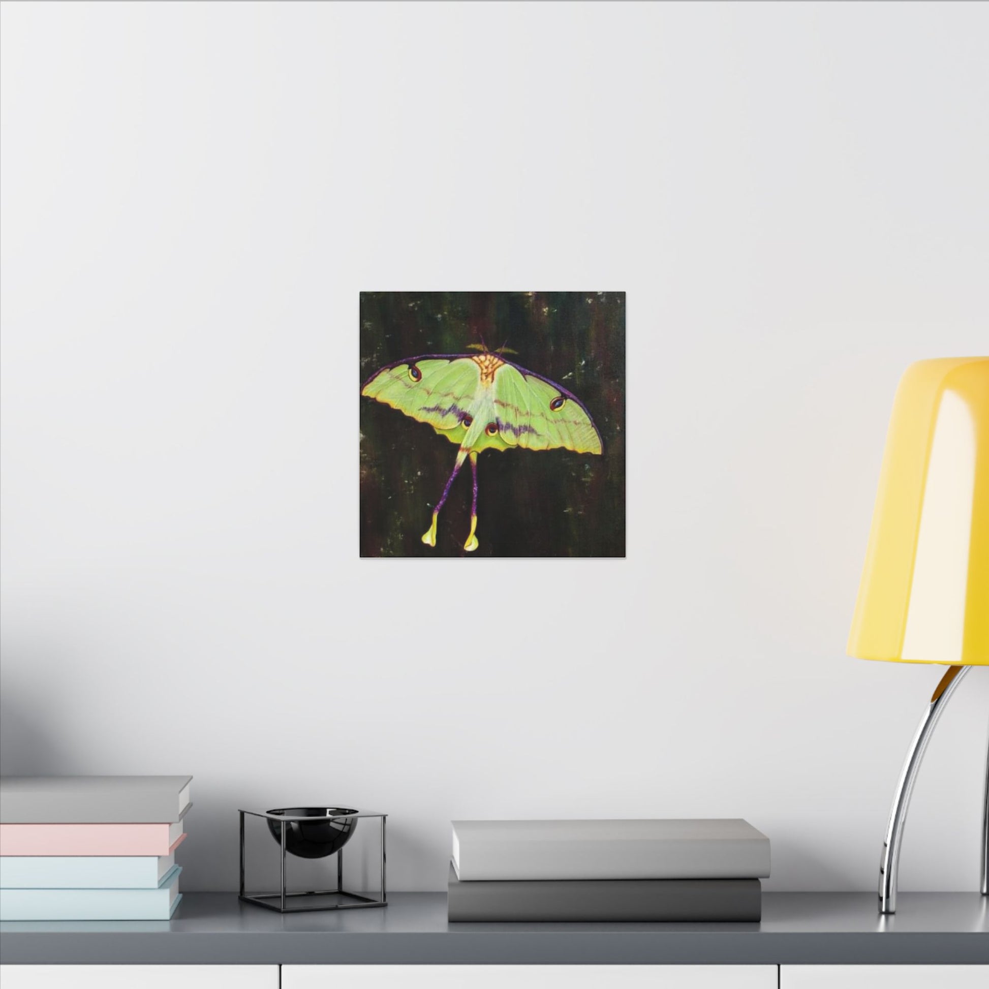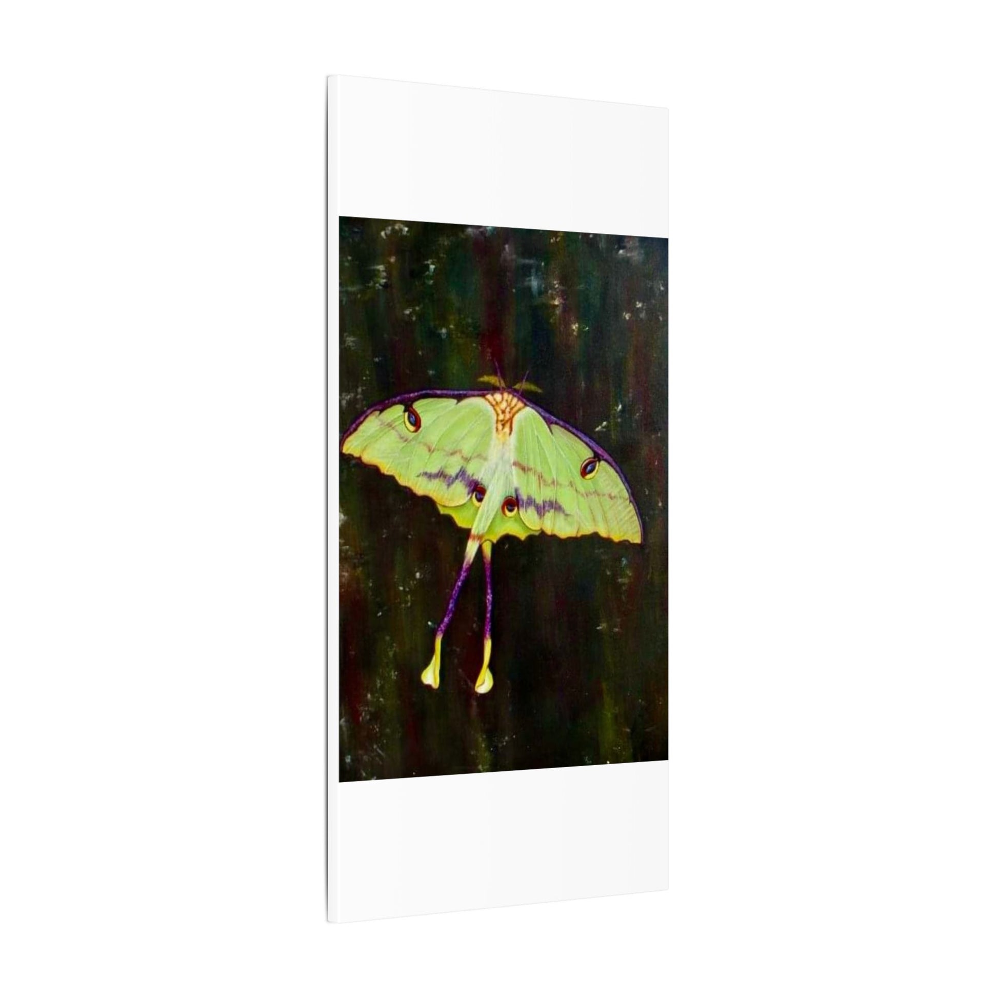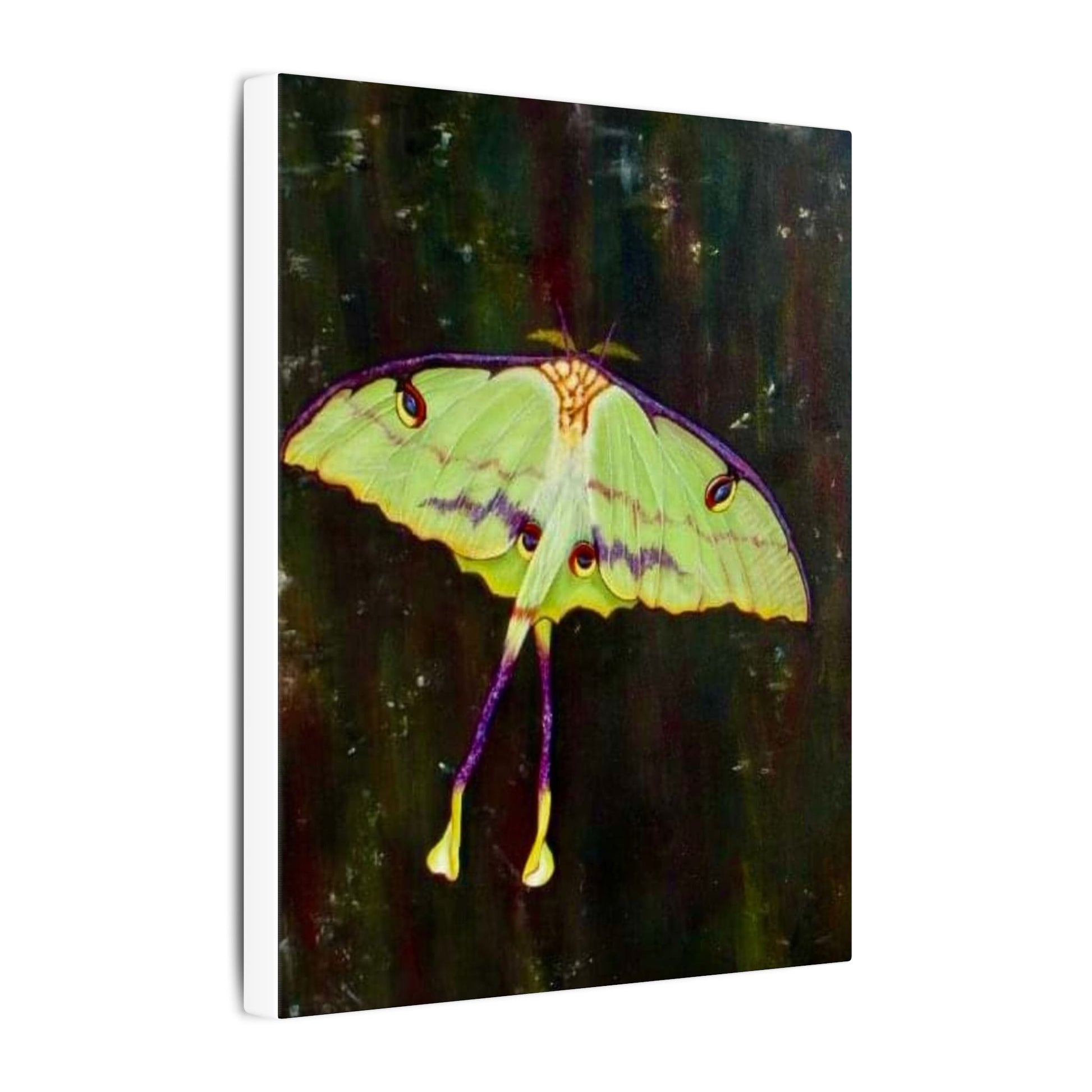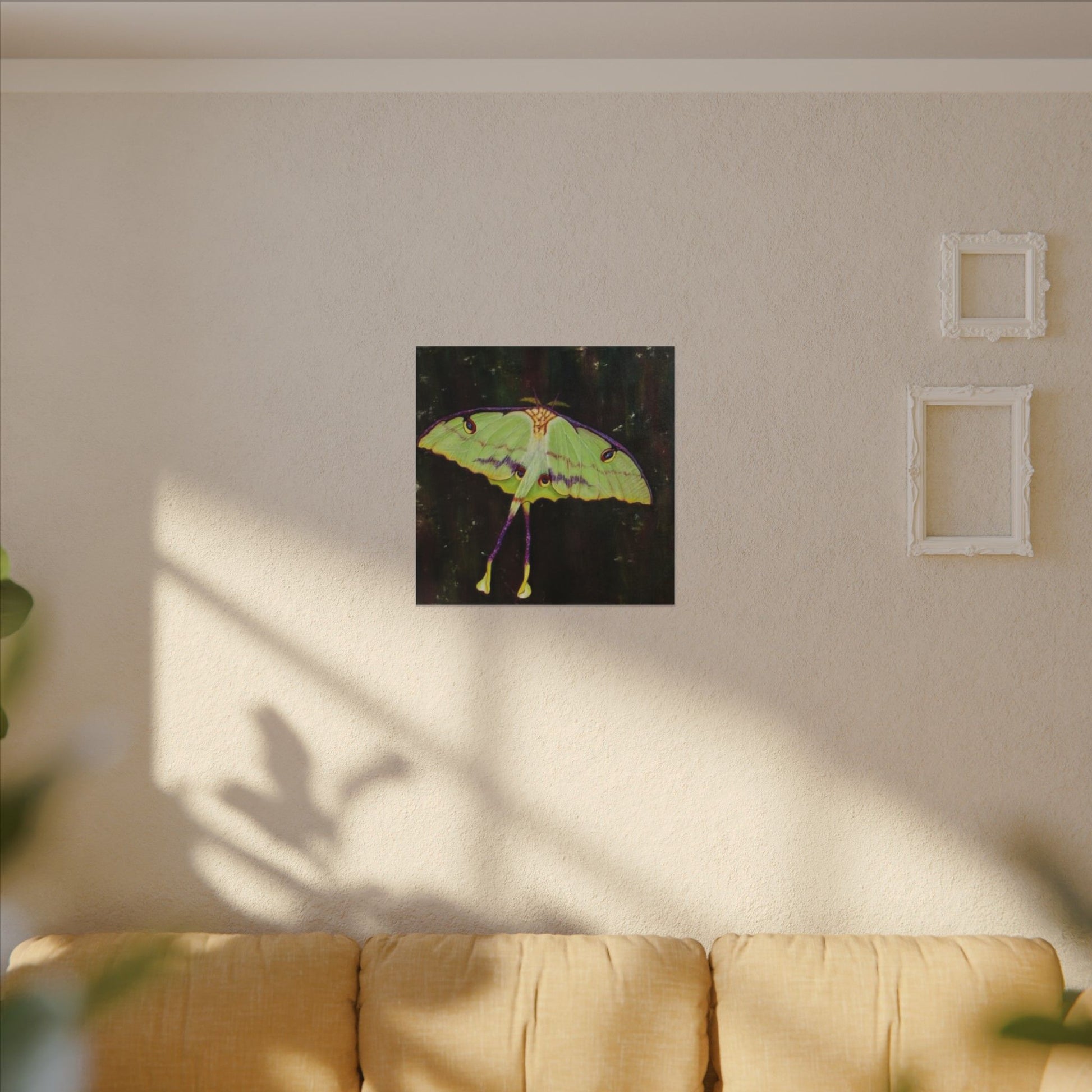 A serene matte canvas print that captures the delicate beauty of luna moths in quiet flight. The muted, velvety finish deepens greens and pale yellows, giving each wing a whisper-soft glow. Stretched over a slim 0.75" pine frame, the artwork reads like a pause in a moonlit corner — gentle, mysterious, and intimate. It brings a calm, natural presence to a bedroom wall, reading nook, or nature-lover’s space, inviting slow moments and late-night wonder. The lightweight profile and clean edges let the moths appear almost suspended above the surface, so they feel alive without overwhelming the room.
