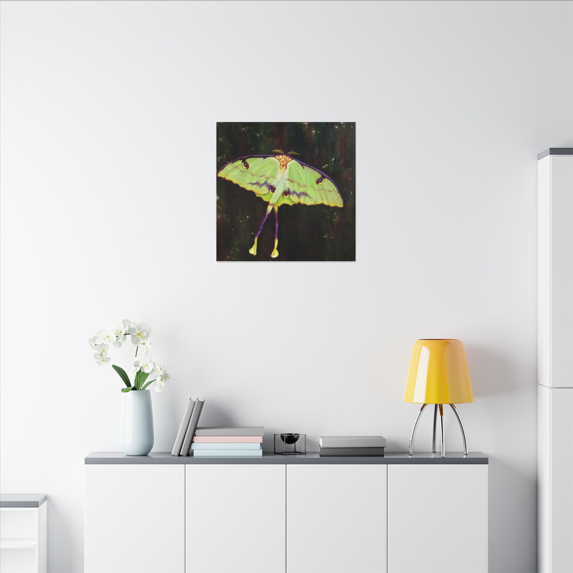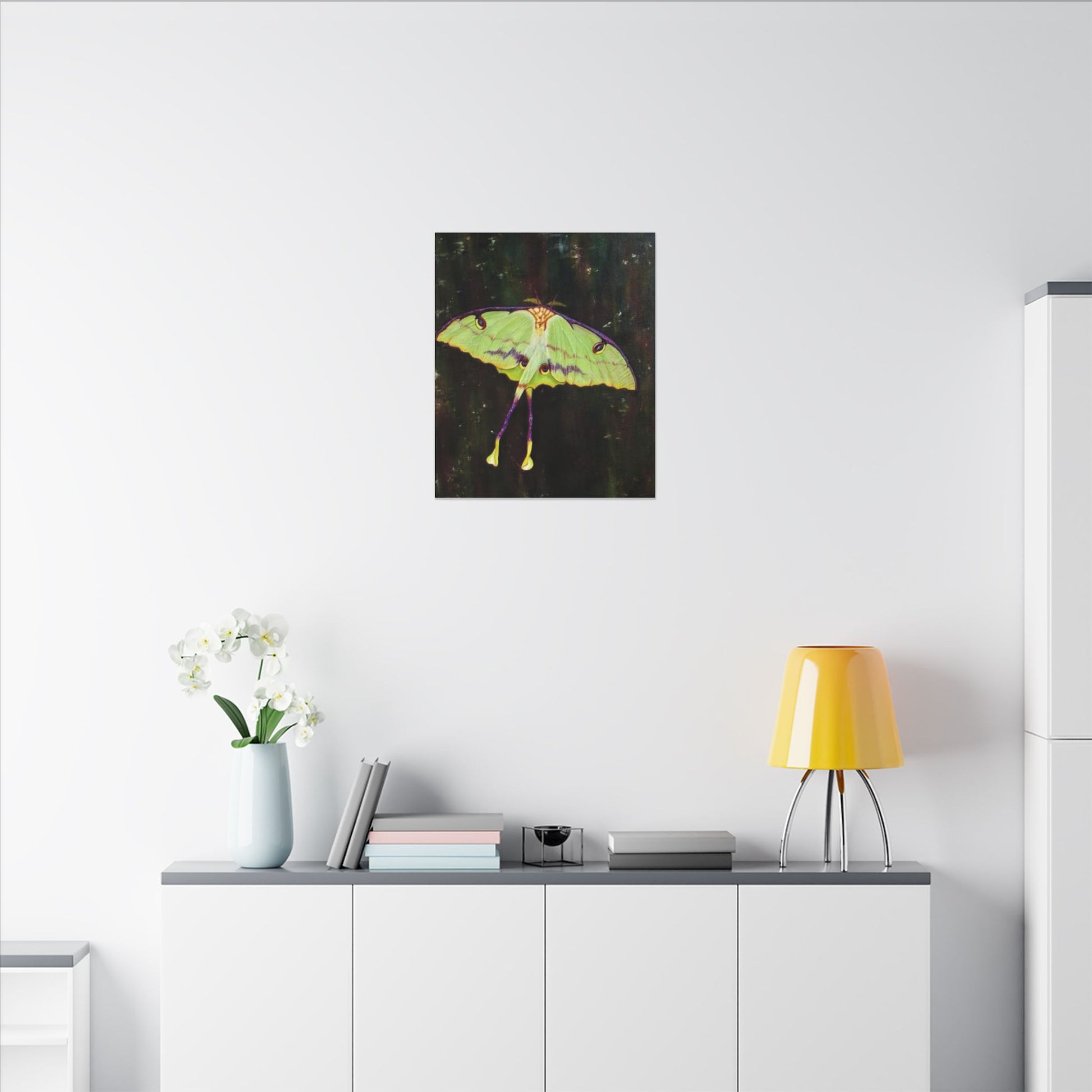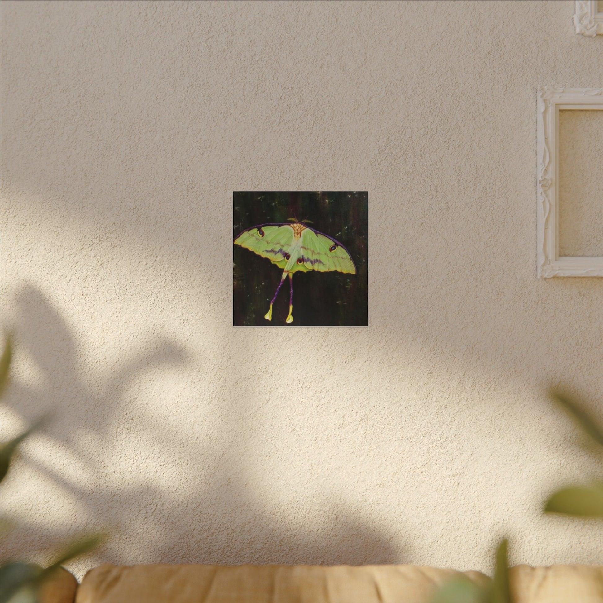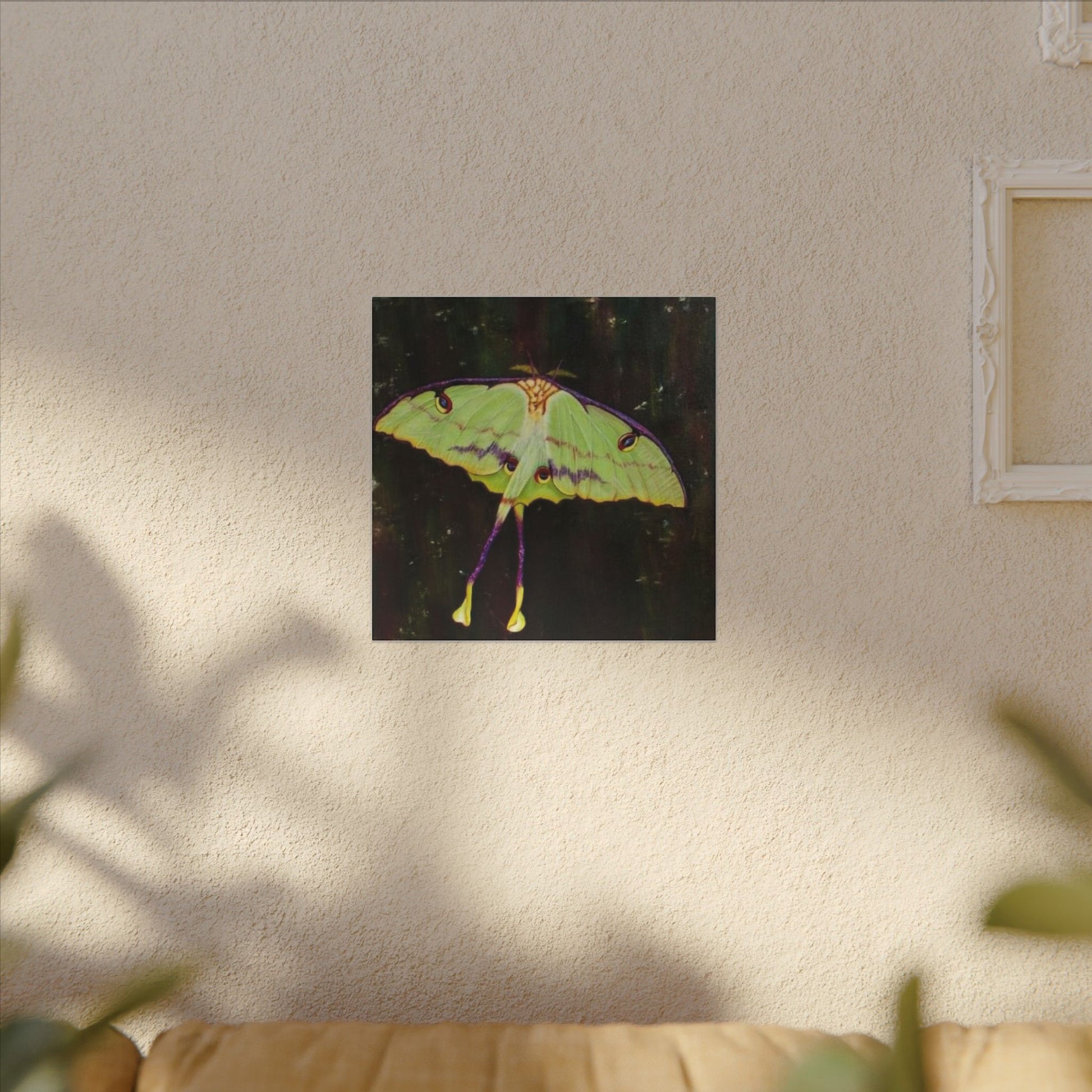 A serene matte canvas print that captures the delicate beauty of luna moths in quiet flight. The muted, velvety finish deepens greens and pale yellows, giving each wing a whisper-soft glow. Stretched over a slim 0.75" pine frame, the artwork reads like a pause in a moonlit corner — gentle, mysterious, and intimate. It brings a calm, natural presence to a bedroom wall, reading nook, or nature-lover’s space, inviting slow moments and late-night wonder. The lightweight profile and clean edges let the moths appear almost suspended above the surface, so they feel alive without overwhelming the room.