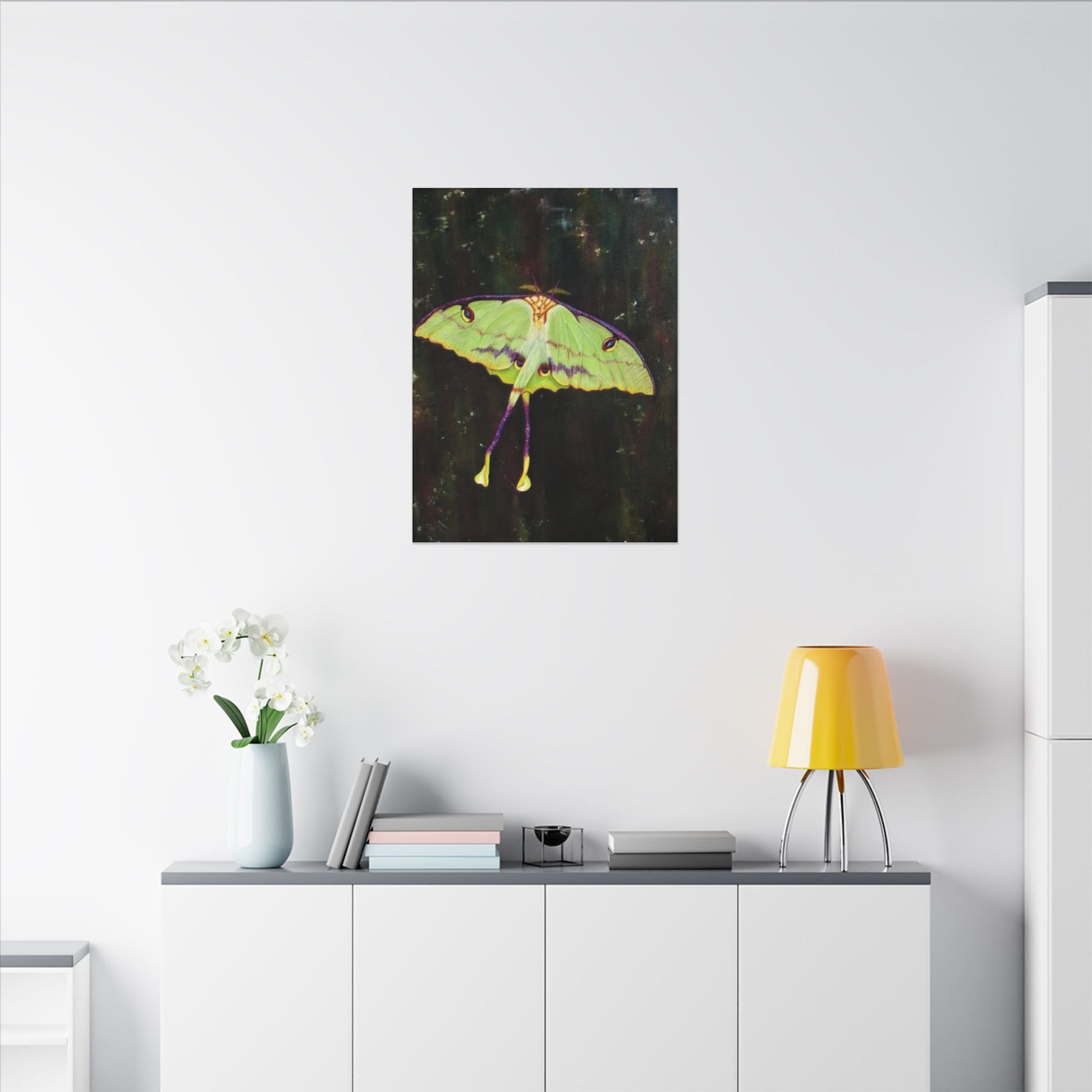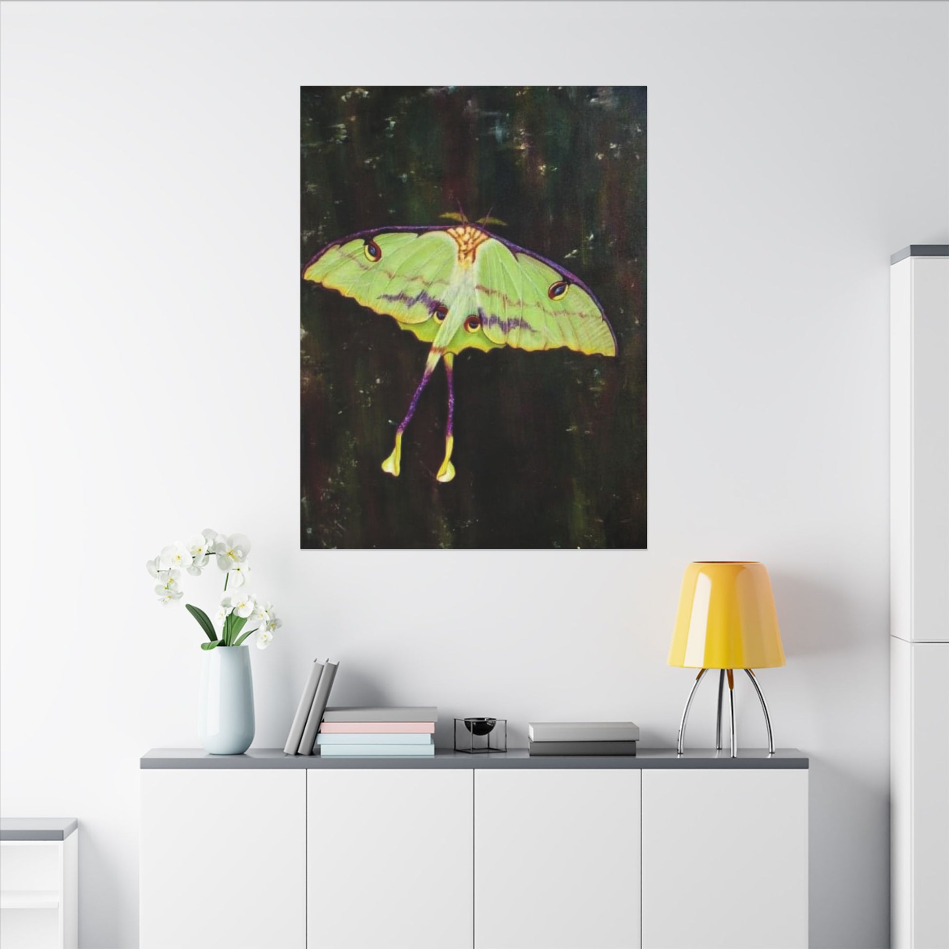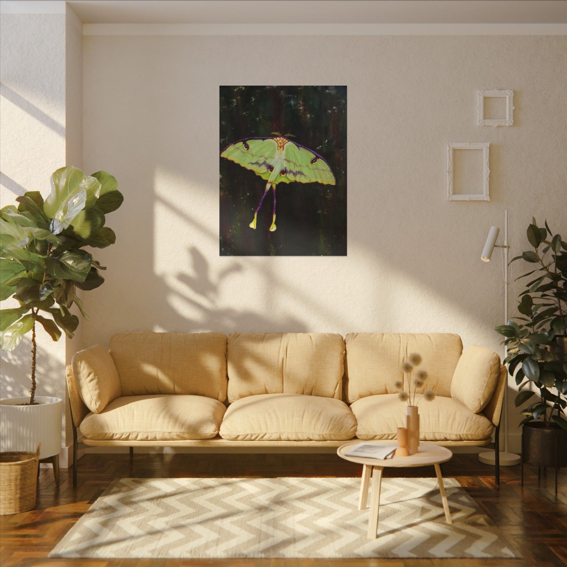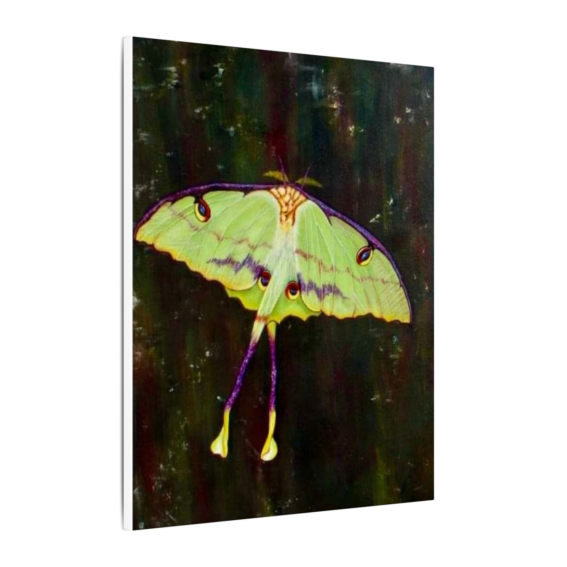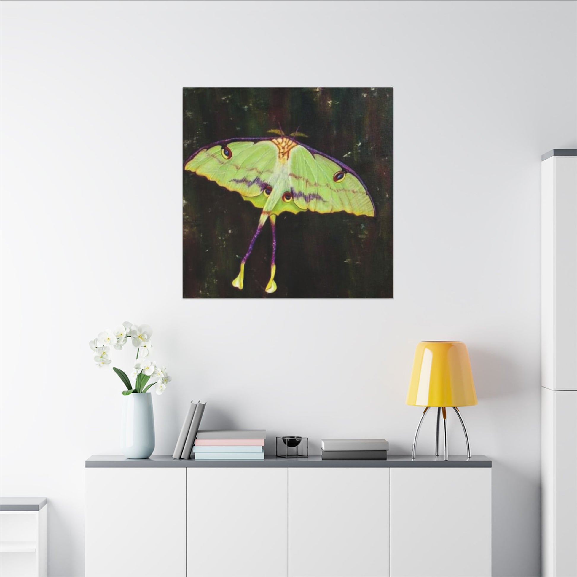 A serene matte canvas print that captures the delicate beauty of luna moths in quiet flight. The muted, velvety finish deepens greens and pale yellows, giving each wing a whisper-soft glow. Stretched over a slim 0.75" pine frame, the artwork reads like a pause in a moonlit corner — gentle, mysterious, and intimate. It brings a calm, natural presence to a bedroom wall, reading nook, or nature-lover’s space, inviting slow moments and late-night wonder. The lightweight profile and clean edges let the moths appear almost suspended above the surface, so they feel alive without overwhelming the room.