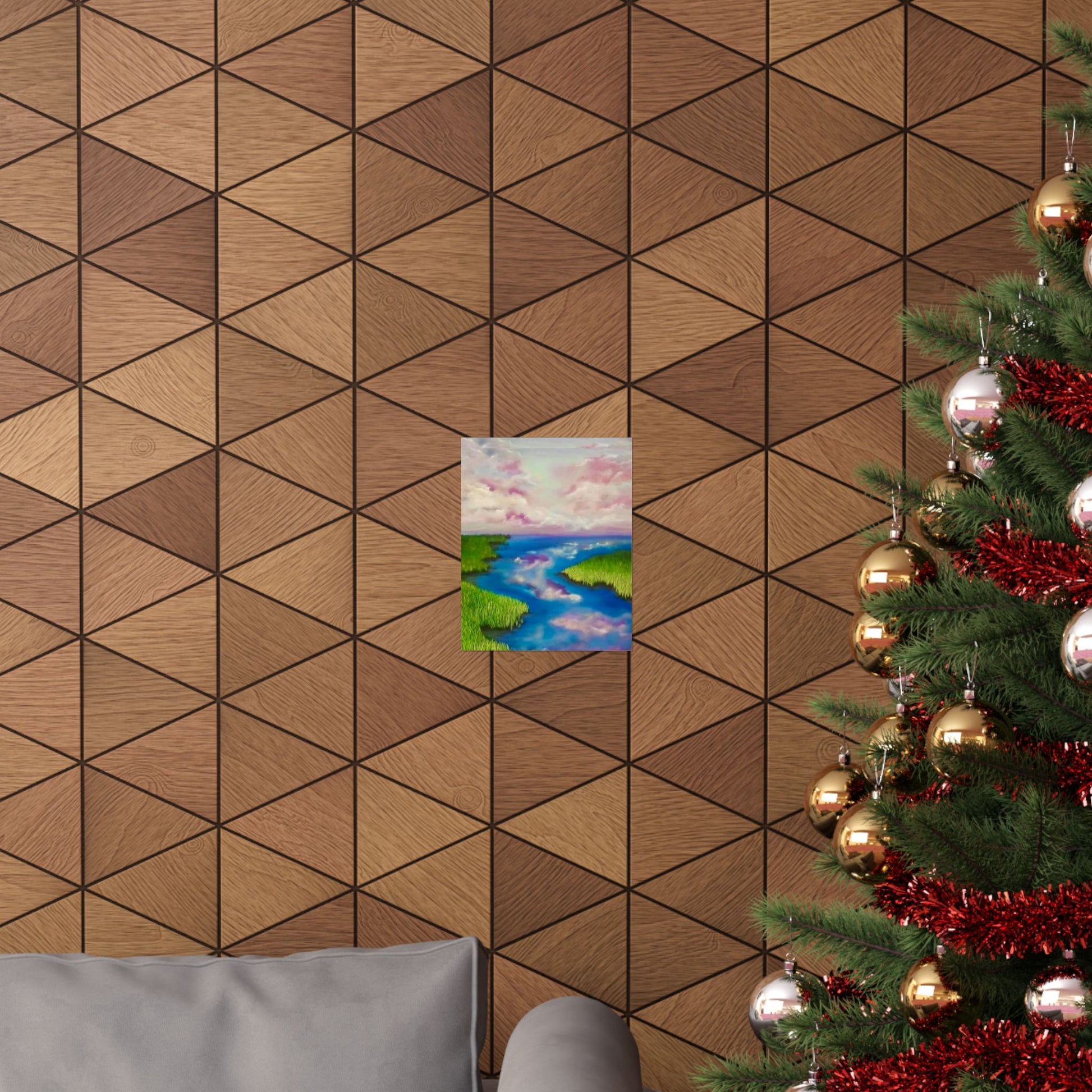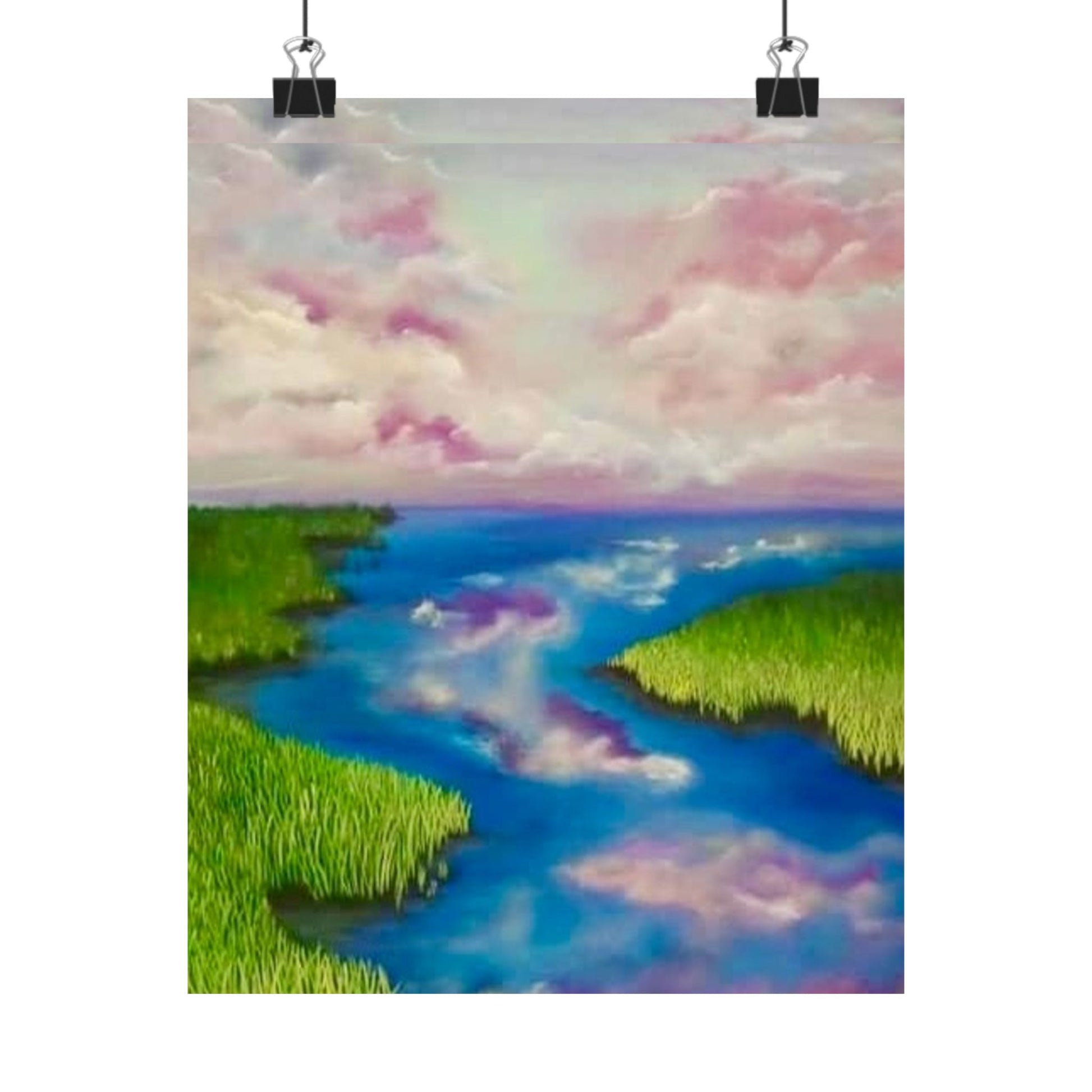 Soft painted marshlands meet a dreamy pastel sky in this matte vertical poster. Brushstrokes of cerulean and lavender guide the eye along winding waterways framed by bright green reeds. The muted, light-absorbing matte finish gives the scene a museum-quality presence without glare, inviting quiet mornings with a cup of coffee or late-night reflection under warm lamp light. This print brings a calm, contemplative atmosphere to an entryway, studio, or bedroom — a peaceful pause that feels both familiar and gently otherworldly.