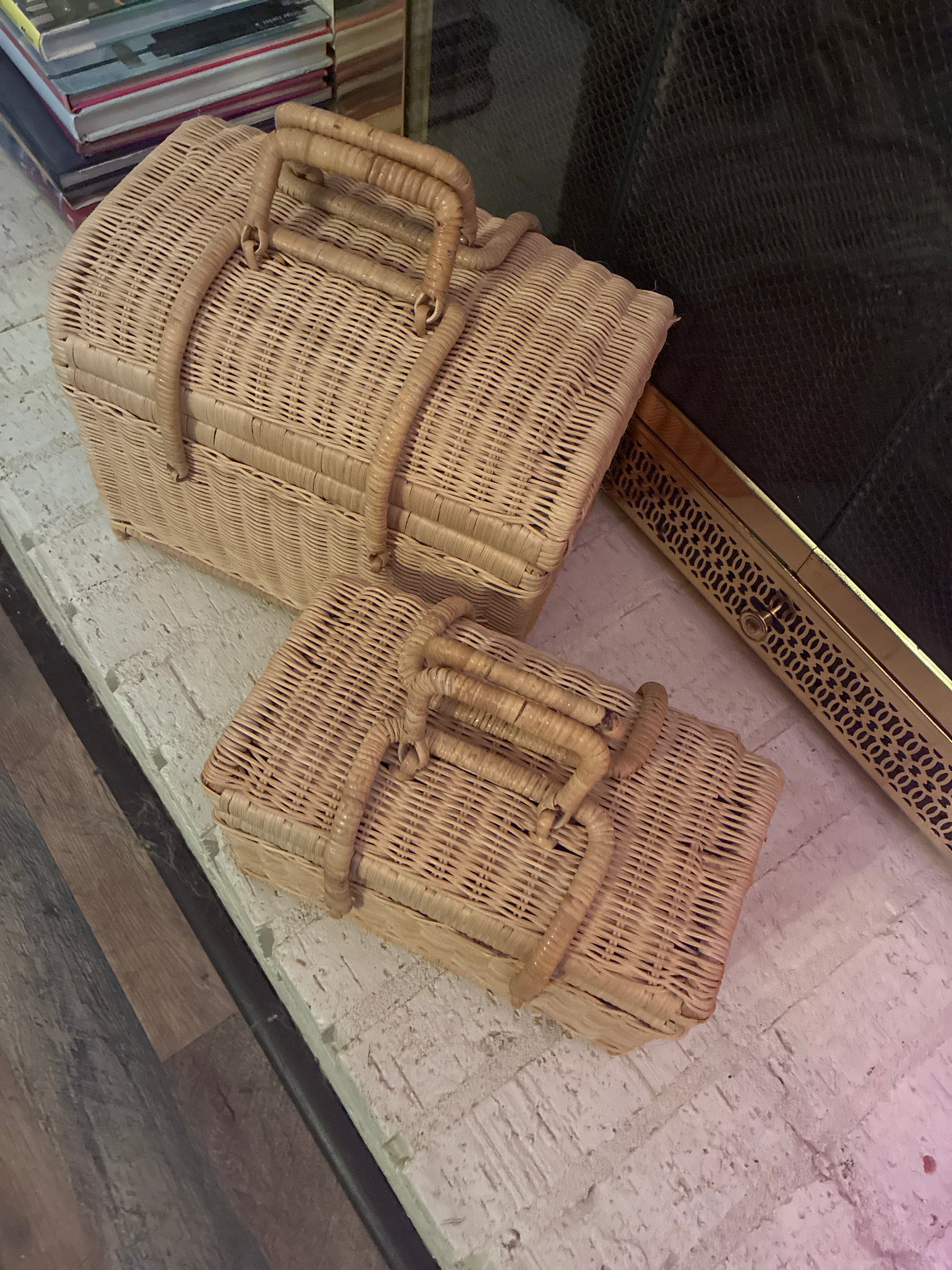 Lovely interlocking handled wicker nesting baskets in natural fiber.