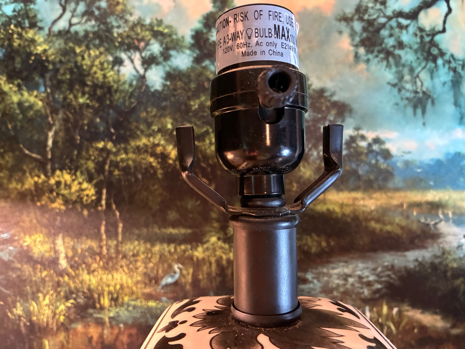 Gor-geous!! This stately pair has the 222 fifth (PTS) muse black damask pattern. Clean,rectangular lines with blunted edges. These stand 17" high from base to top (21.25" to top of bulb fixture) and 5.5"wide. Any harp fixture can be added to accomodate your lampshades.