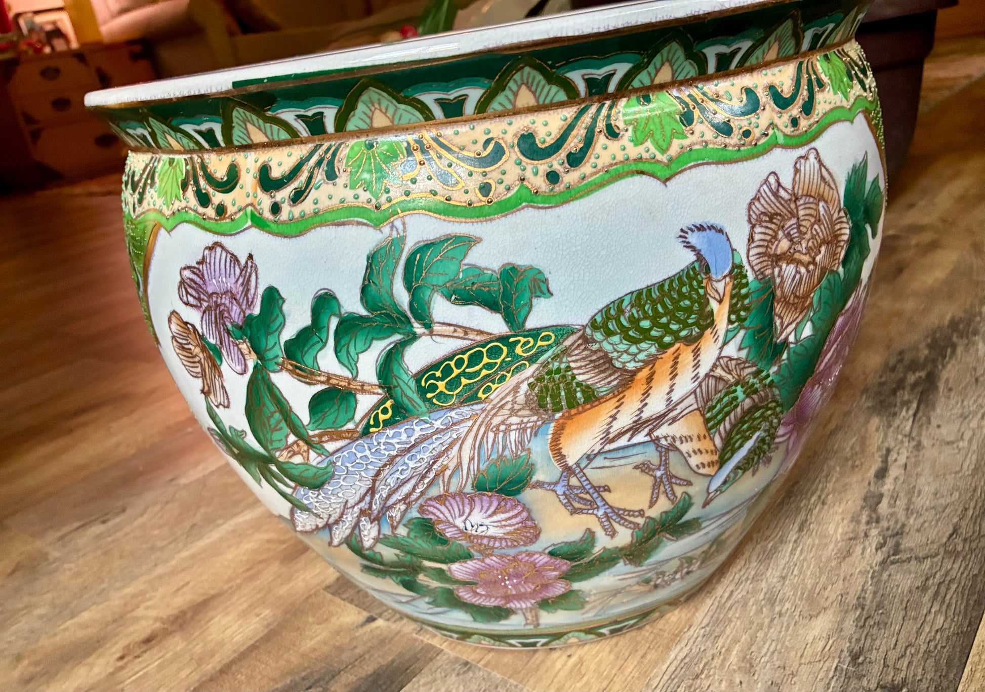 Experience the beauty of nature with our porcelain Satsuma ware koi fishbowl planter! Featuring a stunning peacock and floral design on the outside and a charming Koi fish on the inside, this 12" x 14 1/2" diameter planter is perfect for showcasing your favorite Monstera or water plant. Just remember, no real fish allowed! We are in Columbia South Carolina and this can be picked up anytime! Just message us so we can set it up as soon as possible