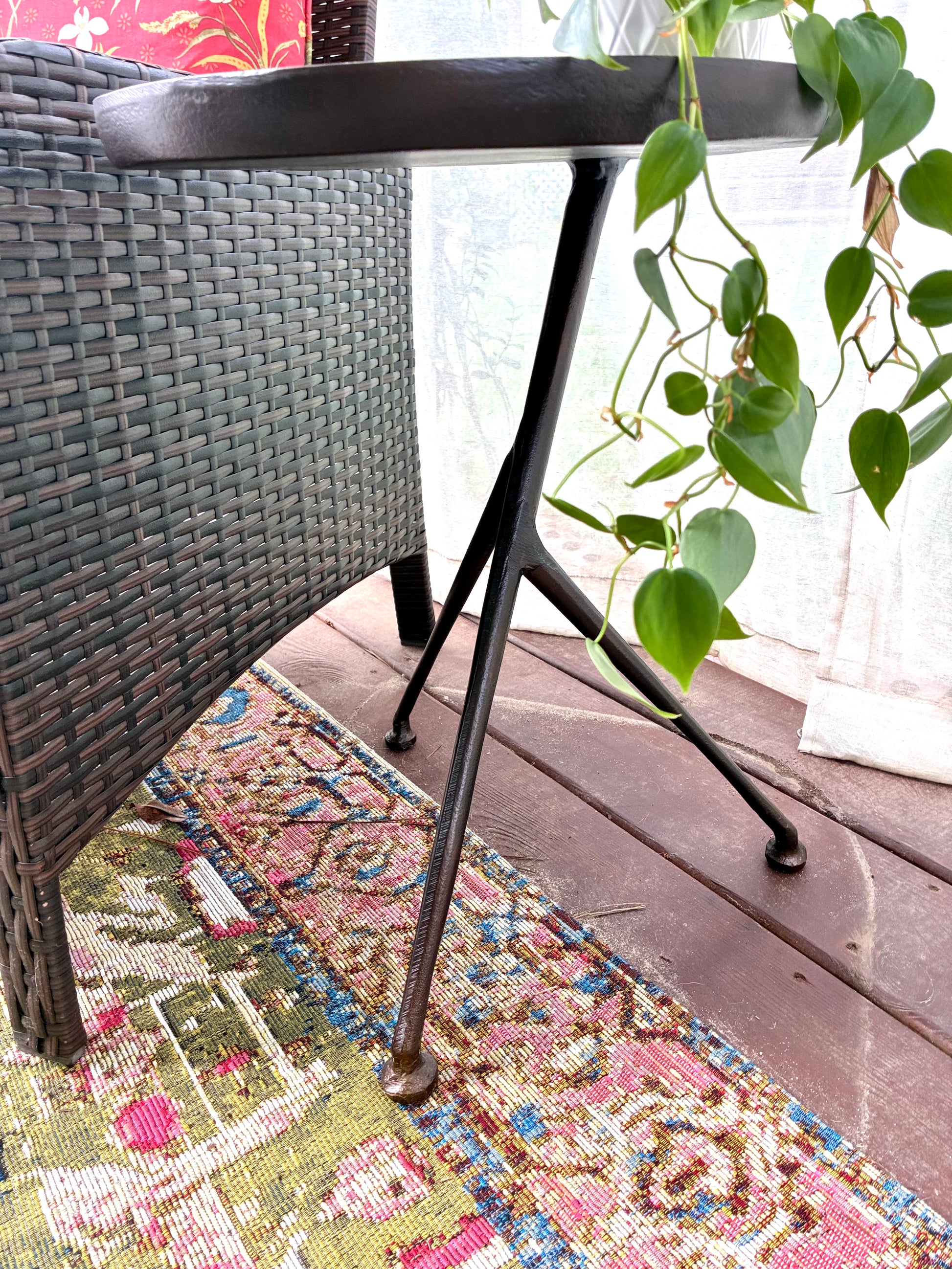 ***SOLD***Beautiful tables for both indoor & out! Very cool offset legs for a modern look with cast iron finish. Oval top eith 1/2in lip. Deep brown/black. 18"x13.5"x21"