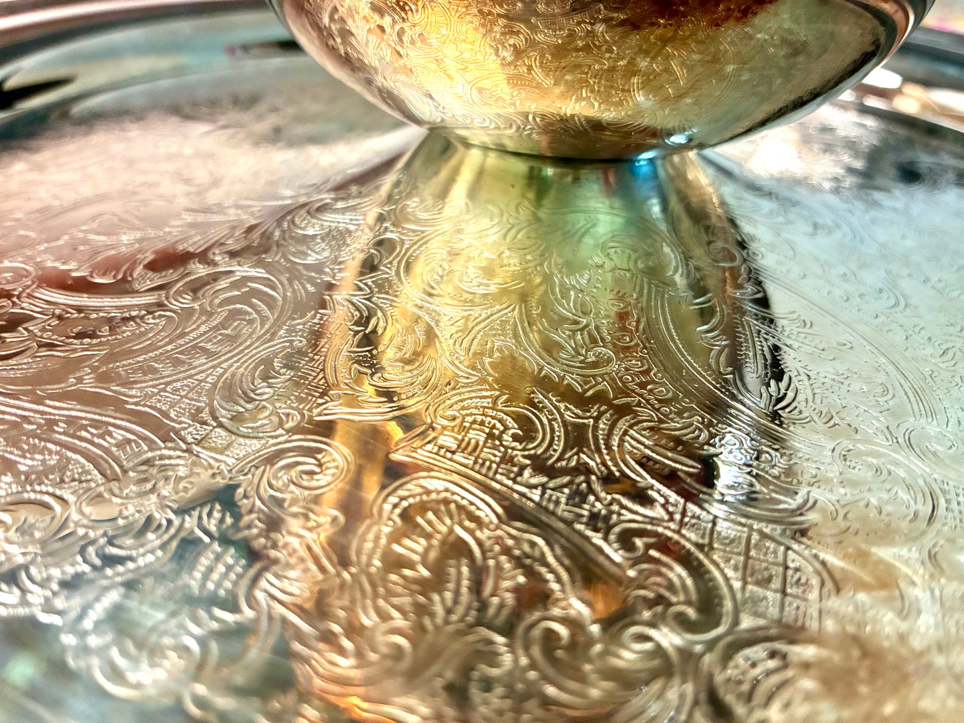 Crafted with exquisite silver plating, this vintage serving tray features ornate etched scroll work for a touch of elegance. The attached bowl is perfect for holding condiments, making serving a breeze. Measuring 12" x 2.75", it's the perfect addition to any dining experience.