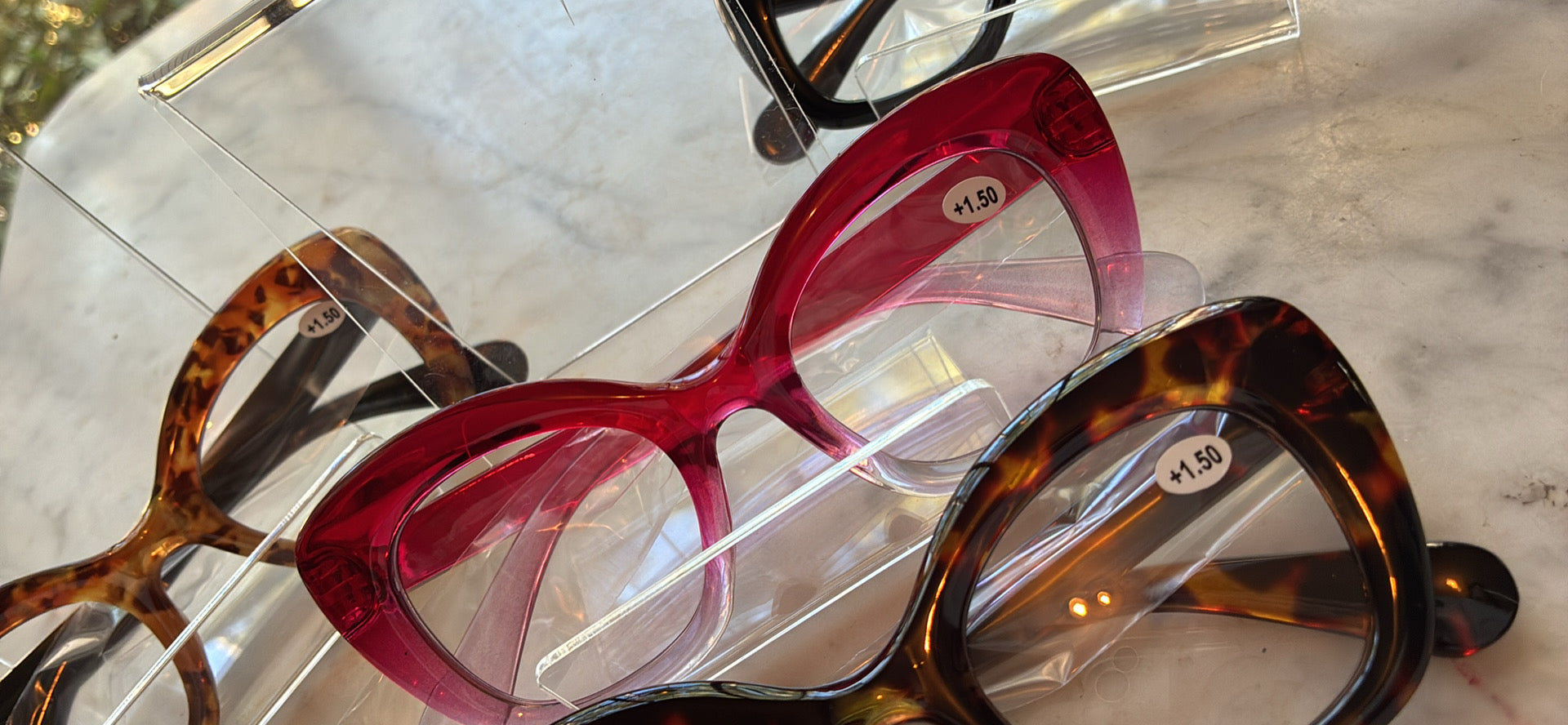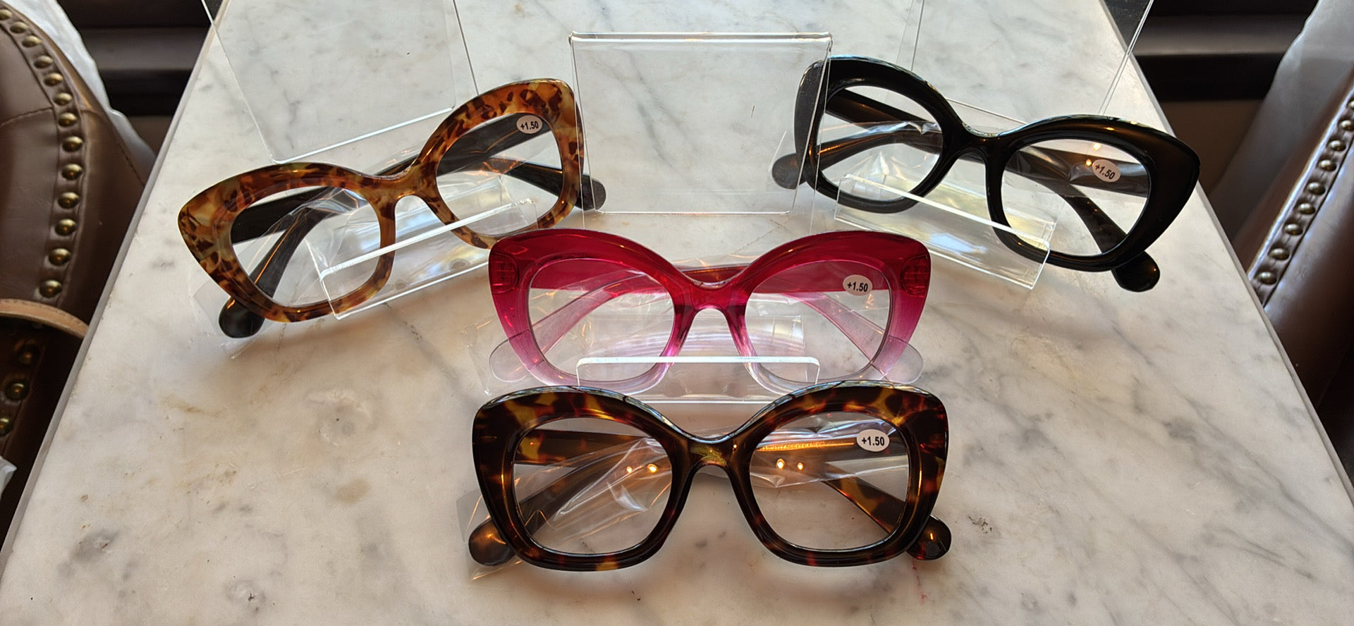 Modern cat eye glasses! It IS possible to be stylish wearing readers! These are 1.5 magnification. Perfect for viewing all your interests from a menu to needlepoint. You're gonna be fabulous!