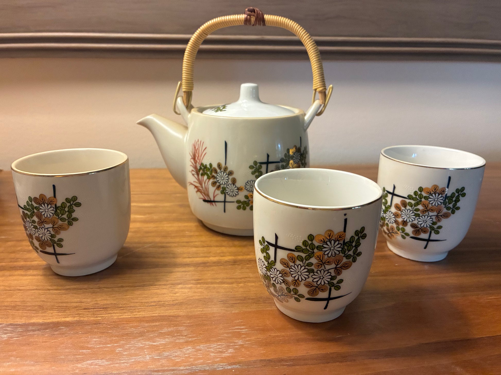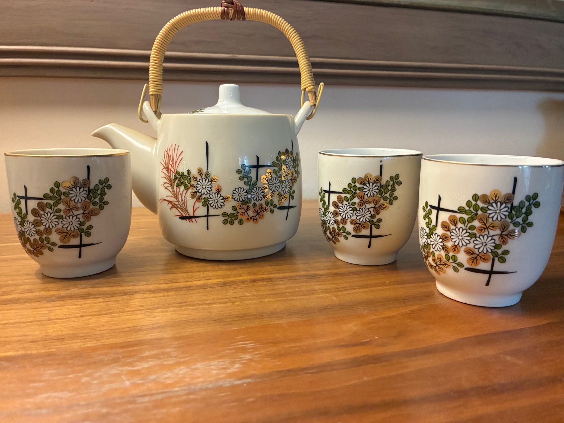 Darling little set with handpainted floral and line design on eggshell base. Dainty Rattan handle on the teapot. 3 tea bowls.