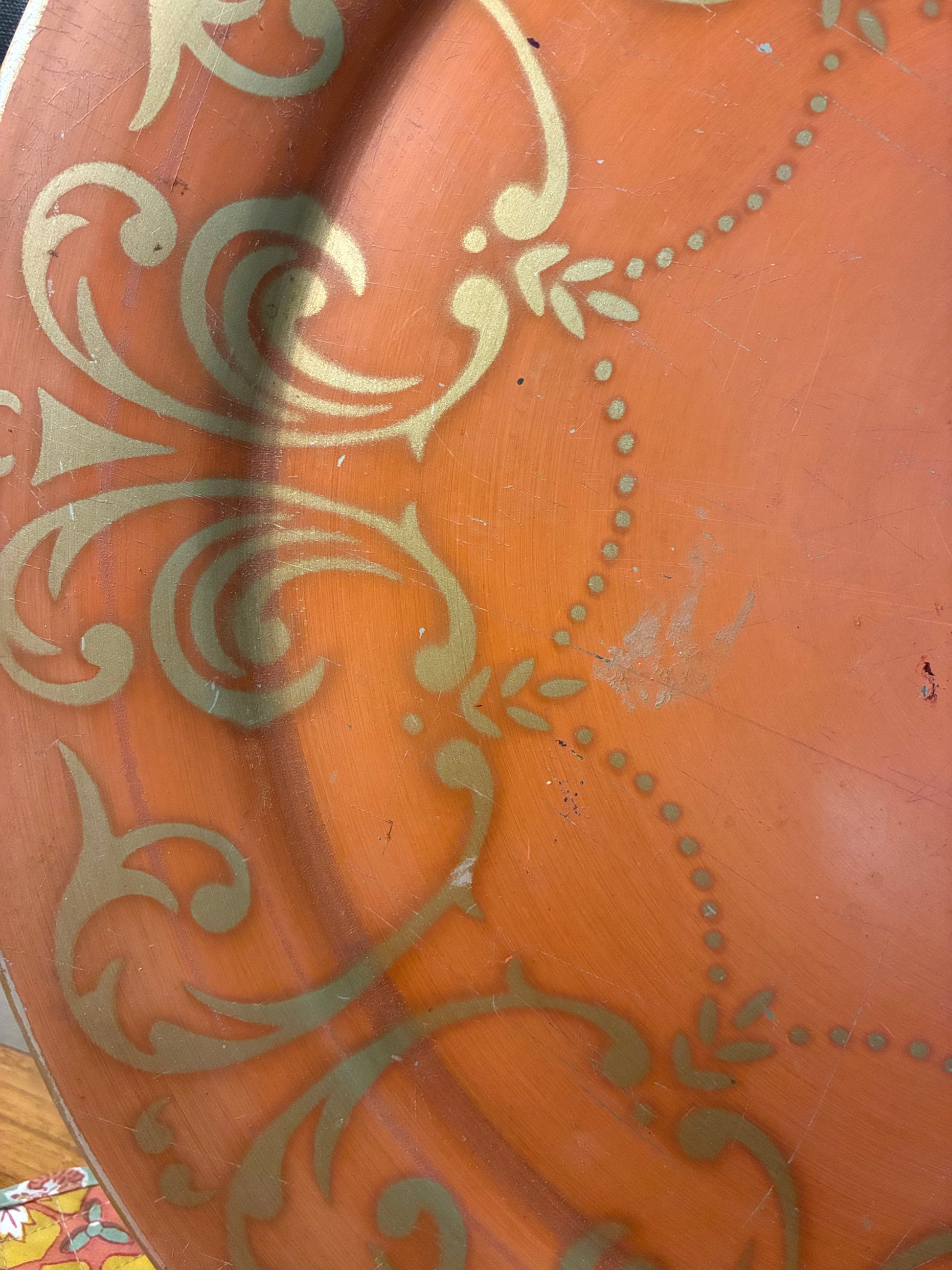 1950's I believe. Muted orange with gold scrollwork highlights. Large 20" but lightweight. Perfect for an underplate or a vignette backdrop. Very unique!